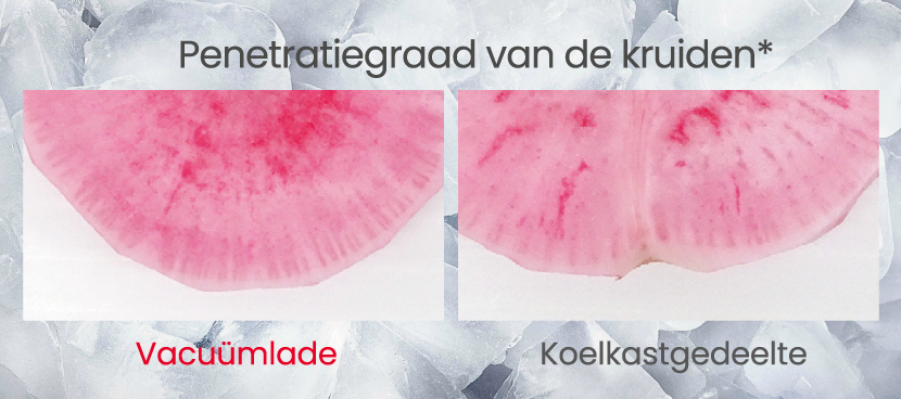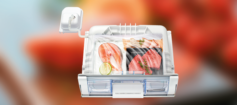 Schnellere Geschmacksaufnahme von Kräutern und MarinadenEine schnellere Geschmacksaufnahme ist möglich, da das Fach Luft aus der Schublade entfernt, wodurch Kräuter oder Marinaden schneller von den Speisen aufgenommen werden können, sodass weniger Zeit für die Zubereitung Ihres Fleisches oder Fischs benötigt wird und Sie mehr Zeit haben, Ihr Essen zu genießen. *Von Hitachi getestet. Die Wirkung kann je nach Frische der gelagerten Lebensmittel unterschiedlich sein.